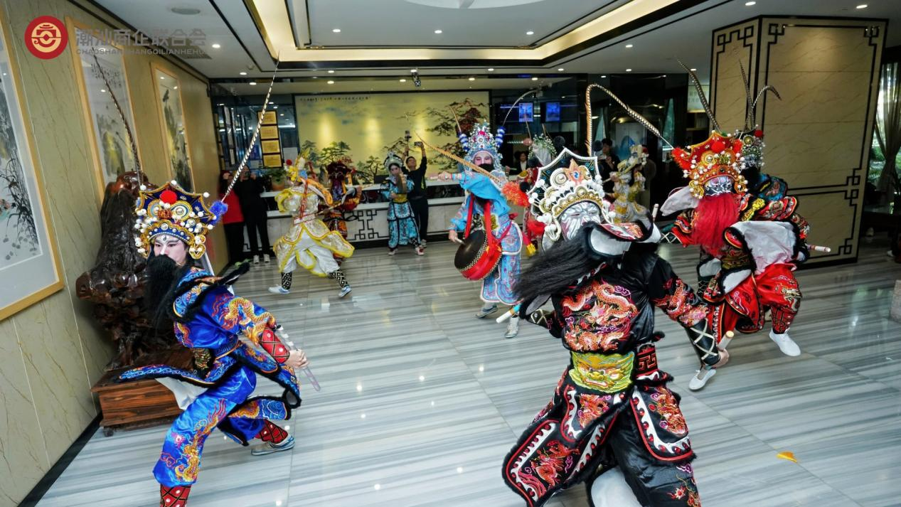 年会伊始,一段气势恢宏的潮汕英歌舞表演在酒店门口热烈上演,瞬间点燃现场气氛,吸引了众多来宾与市民驻足观看,彰显了深厚的潮汕文化底蕴。暖场环节,潮汕歌手陈舜莲献唱了《爱拼才会赢》等多首经典曲目,为盛会预热。